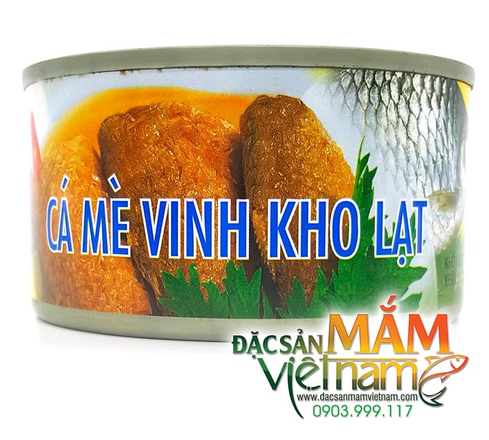 Cá mè vinh chế biến sẵn đầu cá đầy sụn, thấm gia vị ngon không thể tả. Đặc biệt, xương cá đã mềm ăn không sợ mắc xương như cá kho truyền thống, được đóng hộp vệ sinh, mang đi xa hoặc để lâu rất tiện.